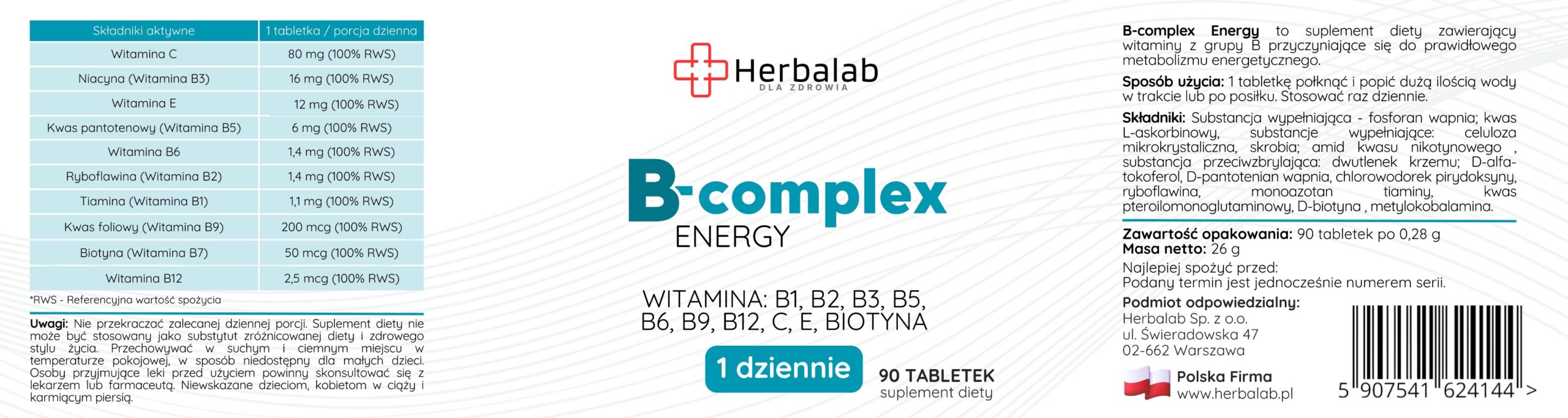 B complex Energy B1,B2,B3,B5,B6,B12,Biotyna 90 tabletek Herbalab