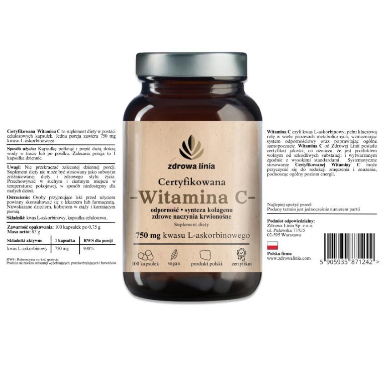 Witamina C czyli kwas L-askorbinowy, pełni kluczową rolę w wielu procesach metabolicznych, wzmacniając system odpornościowy oraz poprawiając ogólne samopoczucie. Witamina C zwiększa odporność organizmu, pomagając w zwalczaniu infekcji i chorób. Jest silnym antyoksydantem – chroni komórki przed szkodliwym działaniem wolnych rodników. Jest boosterem dla syntezy kolagenu, niezbędnego dla utrzymania elastyczności skóry, zdrowia stawów i sprężystości naczyń krwionośnych. Systematyczne stosowanie Certyfikowanej witaminy C może przyczynić się do redukcji zmęczenia i znużenia, podnosząc ogólny poziom energii.