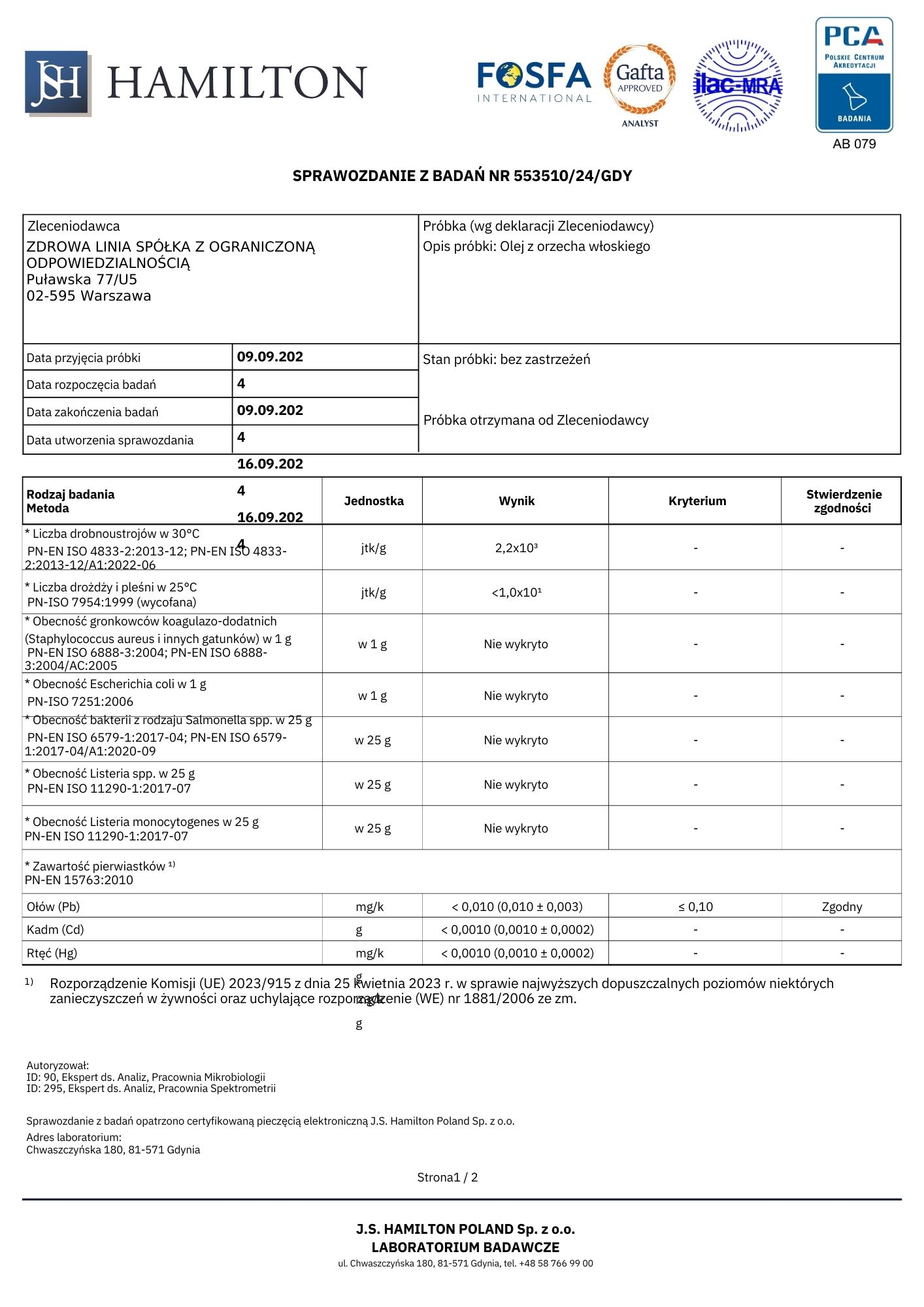 Certyfikowany Olej z Orzechów Włoskich to produkt klasy premium, którego jakość i bezpieczeństwo zostały zweryfikowane przez renomowane laboratorium J.S. Hamilton Poland. Laboratorium to działa zgodnie z najwyższymi standardami, zatwierdzonymi przez Polskie Centrum Akredytacji, a także posiada uznanie międzynarodowych organizacji, takich jak FOSFA i GAFTA.