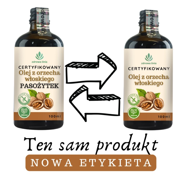 Ze względu na stopniowy proces wprowadzania nowych etykiet, istnieje możliwość, że zamawiając produkt, otrzymają Państwo jeszcze wersję z dotychczasową etykietą „Certyfikowany olej z orzecha włoskiego Pasożytek”. Obie wersje są jednak identyczne pod względem zawartości i jakości.