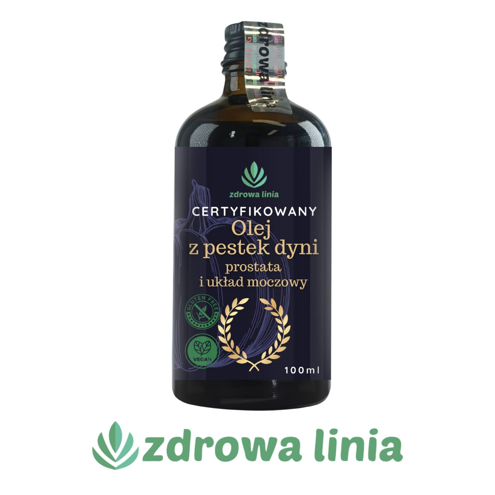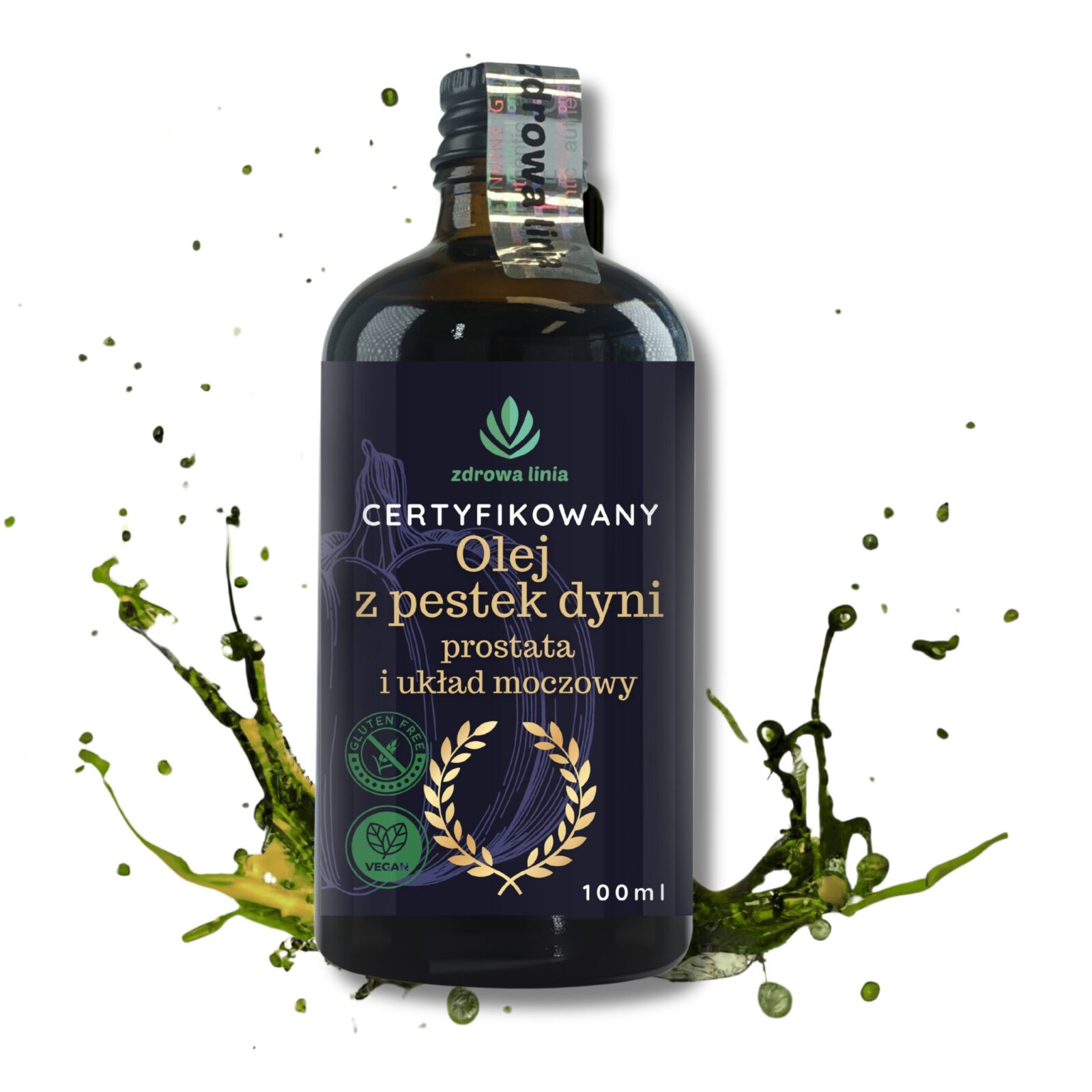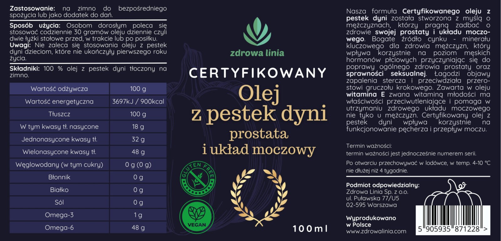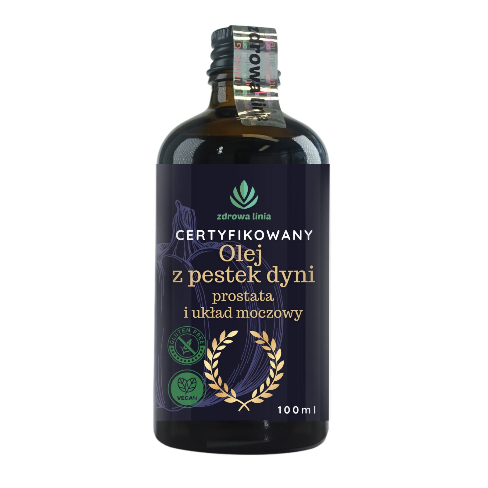 najwyższej jakości, nierafinowany olej tłoczony na zimno, dostępny w ciemnej, szklanej butelce, która chroni produkt przed szkodliwym wpływem światła i zapewnia długotrwałą świeżość. Olej z pestek dyni to cenny składnik diety, szczególnie korzystny dla zdrowia dolnych dróg moczowych.