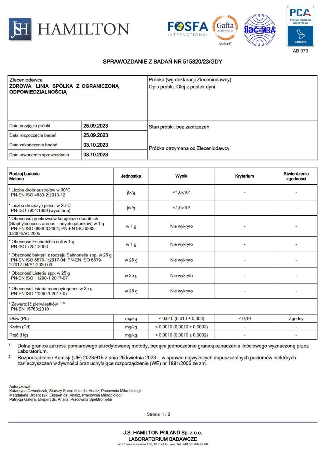 Badania naszych produktów wykonywane są w niezależnym, certyfikowanym laboratorium J.S. Hamilton Poland, które spełnia najwyższe normy jakościowe, potwierdzone min. przez Polskie Centrum Akredytacji oraz członkostwo w organizacjach krajowych i międzynarodowych, takich jak FOSFA oraz GAFTA.