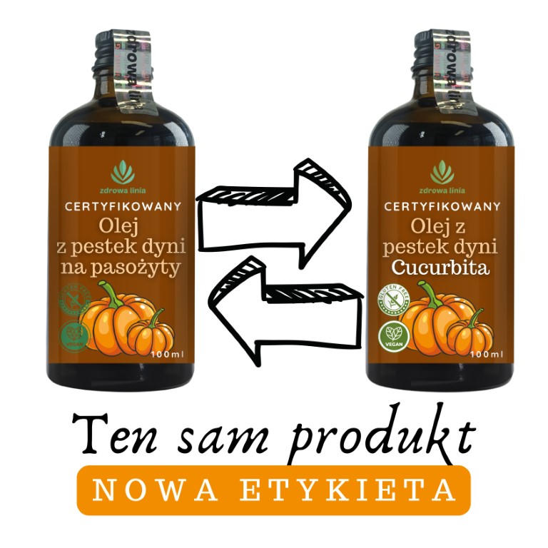 Ze względu na stopniowy proces wprowadzania nowych etykiet, istnieje możliwość, że zamawiając produkt, otrzymają Państwo jeszcze wersję z dotychczasową etykietą „Olej z pestek dyni na pasożyty”. Obie wersje są jednak identyczne pod względem zawartości i jakości.