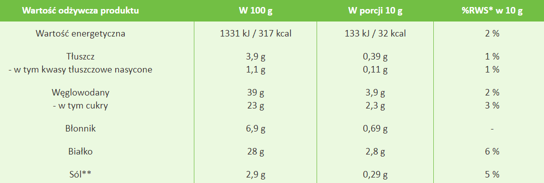 *RWS – Referencyjne Wartości Spożycia przeciętnej osoby dorosłej (8400kJ/2000kcal).