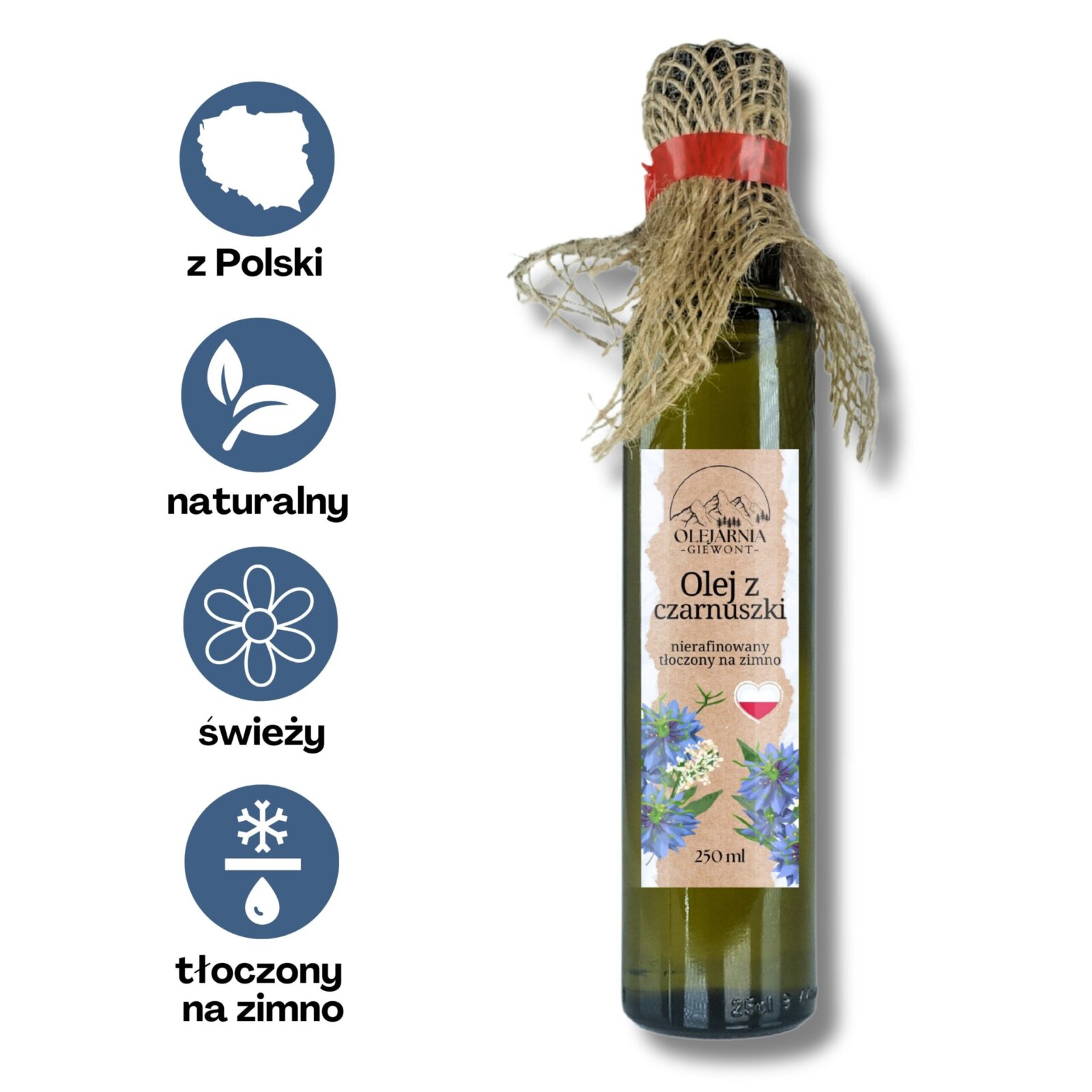 Pochodzenie: Produkt z Polski, tłoczony na zimno w Olejarni Giewont.