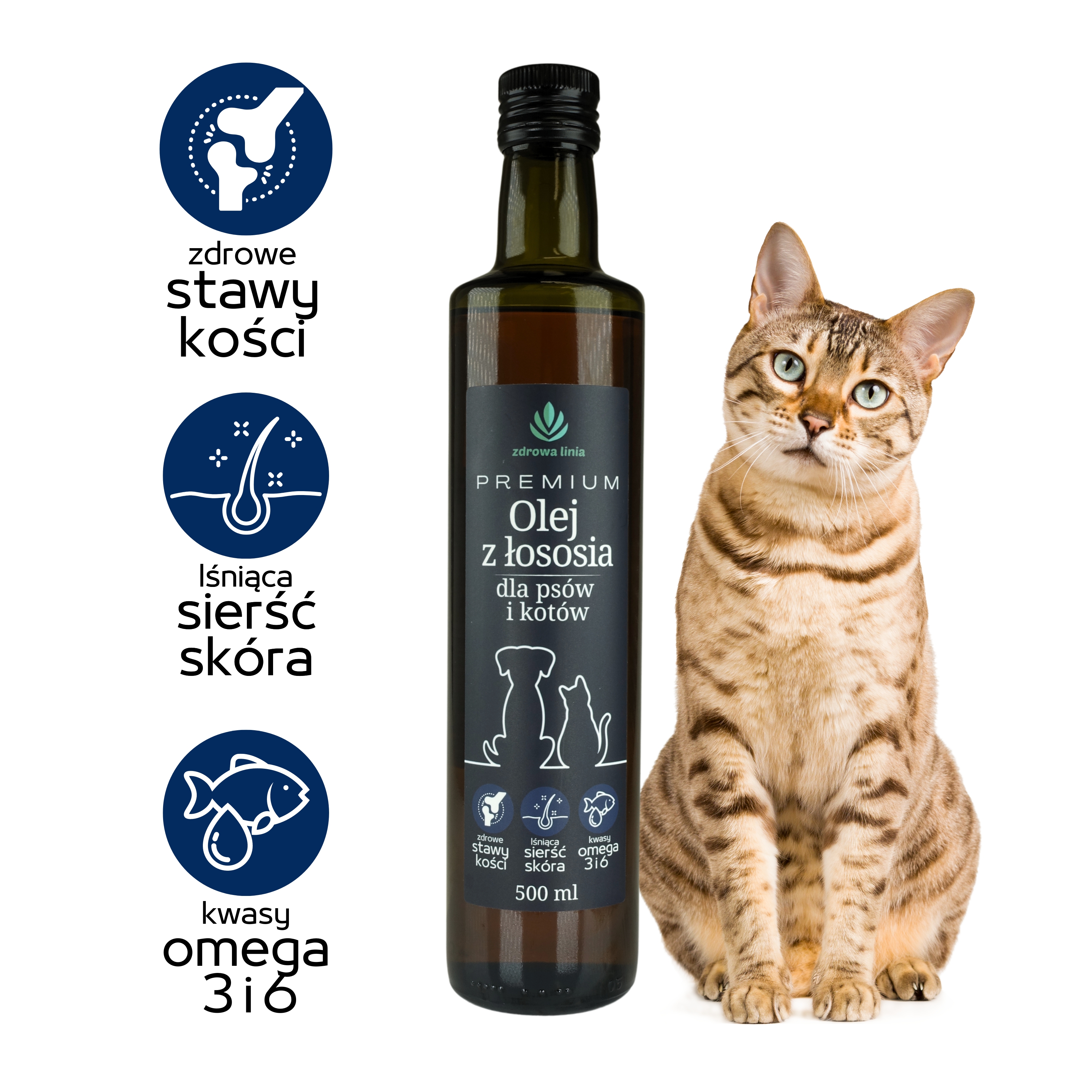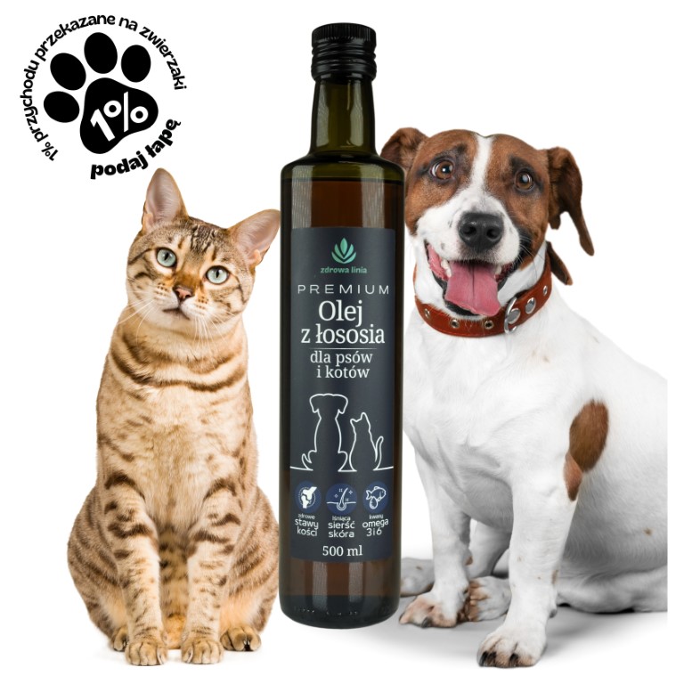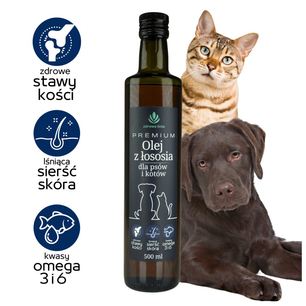 Olej z łososia jest idealnym dodatkiem do diety psów i kotów, wspierając ich zdrowie na wielu poziomach. Zapewnij swojemu zwierzakowi kompleksową opiekę i zdrowie dzięki naszemu Premium Olejowi z Łososia!
