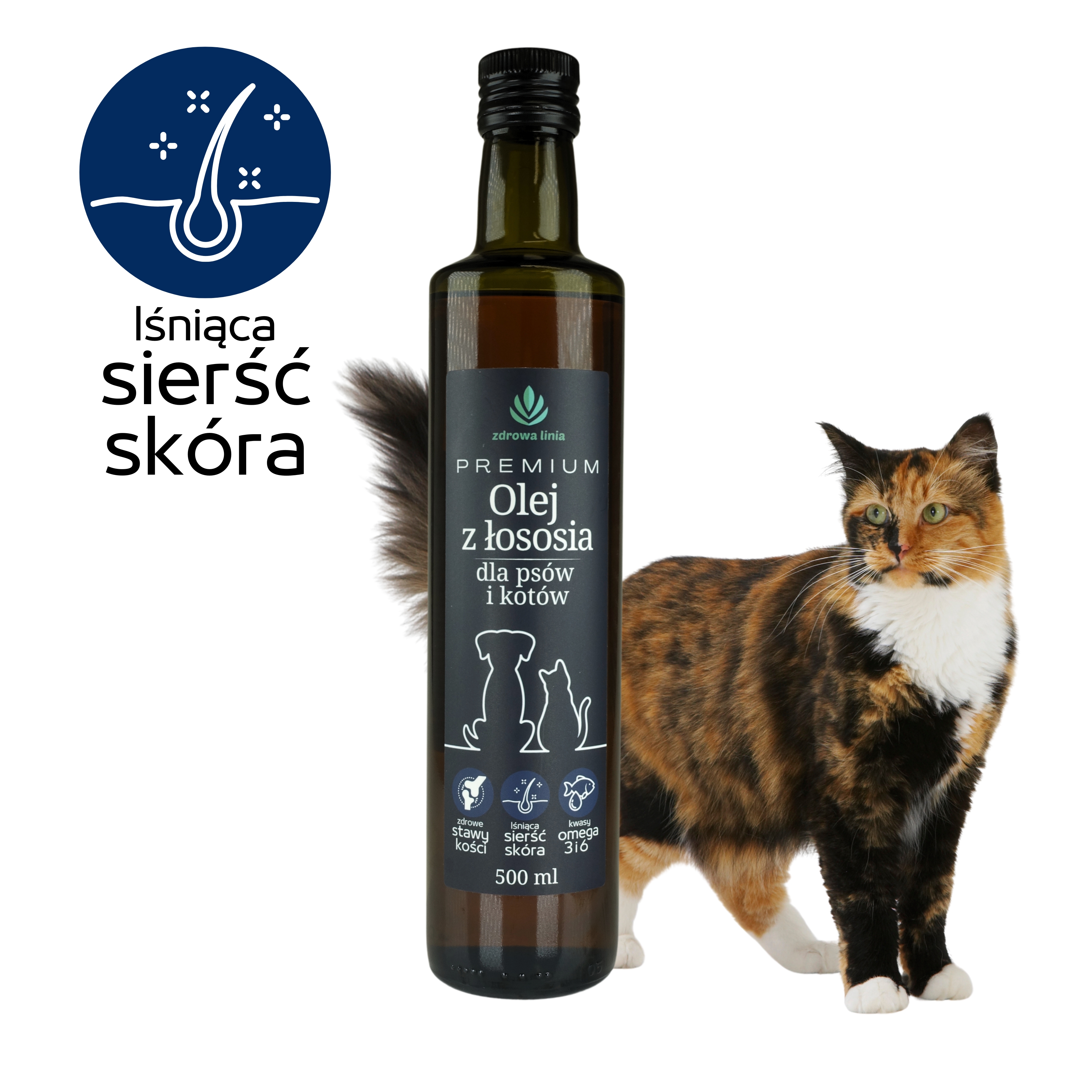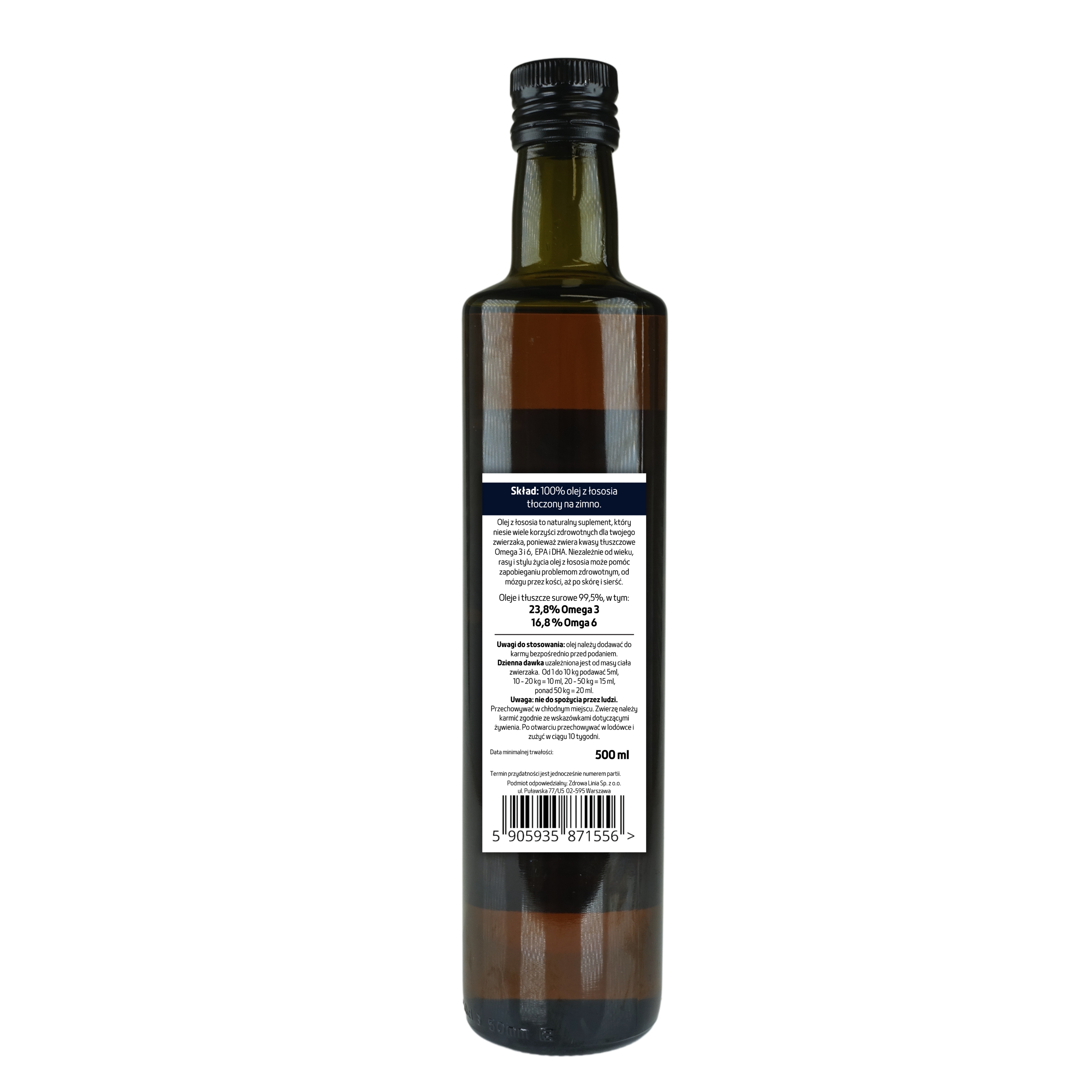 Oferujemy najwyższej jakości Premium Olej z Łososia dla psów i kotów, dostępny w szklanej, ciemnej butelce o pojemności 500 ml. Ten cenny olej jest doskonałym uzupełnieniem diety Twojego ukochanego zwierzaka, wzbogacając ją w niezbędne kwasy tłuszczowe Omega-3 i Omega-6, w tym EPA i DHA.