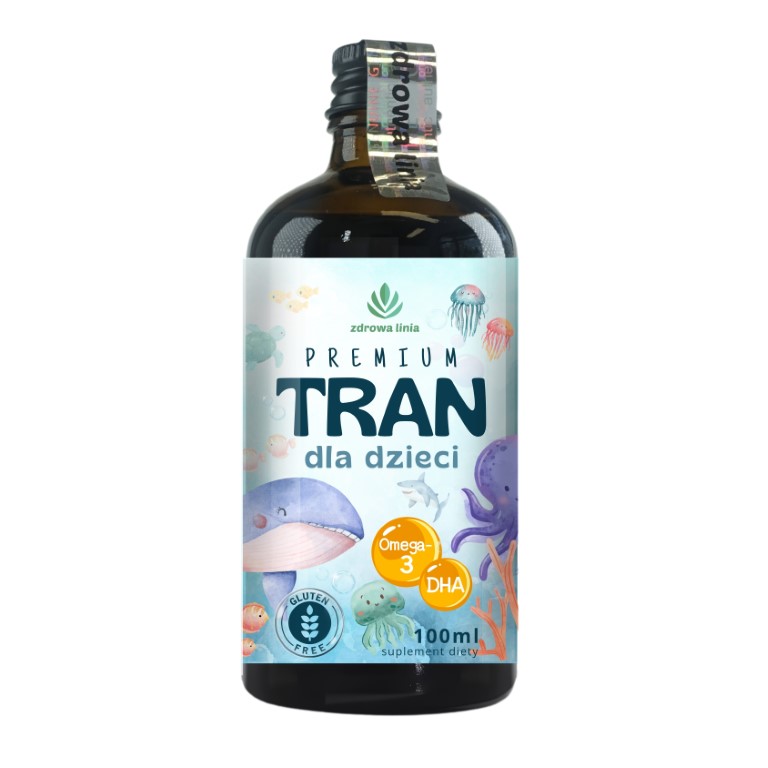 Premium Tran dla dzieci 100 ml olej z wątroby dorsza DHA Omega3 źródło D3 i wit A