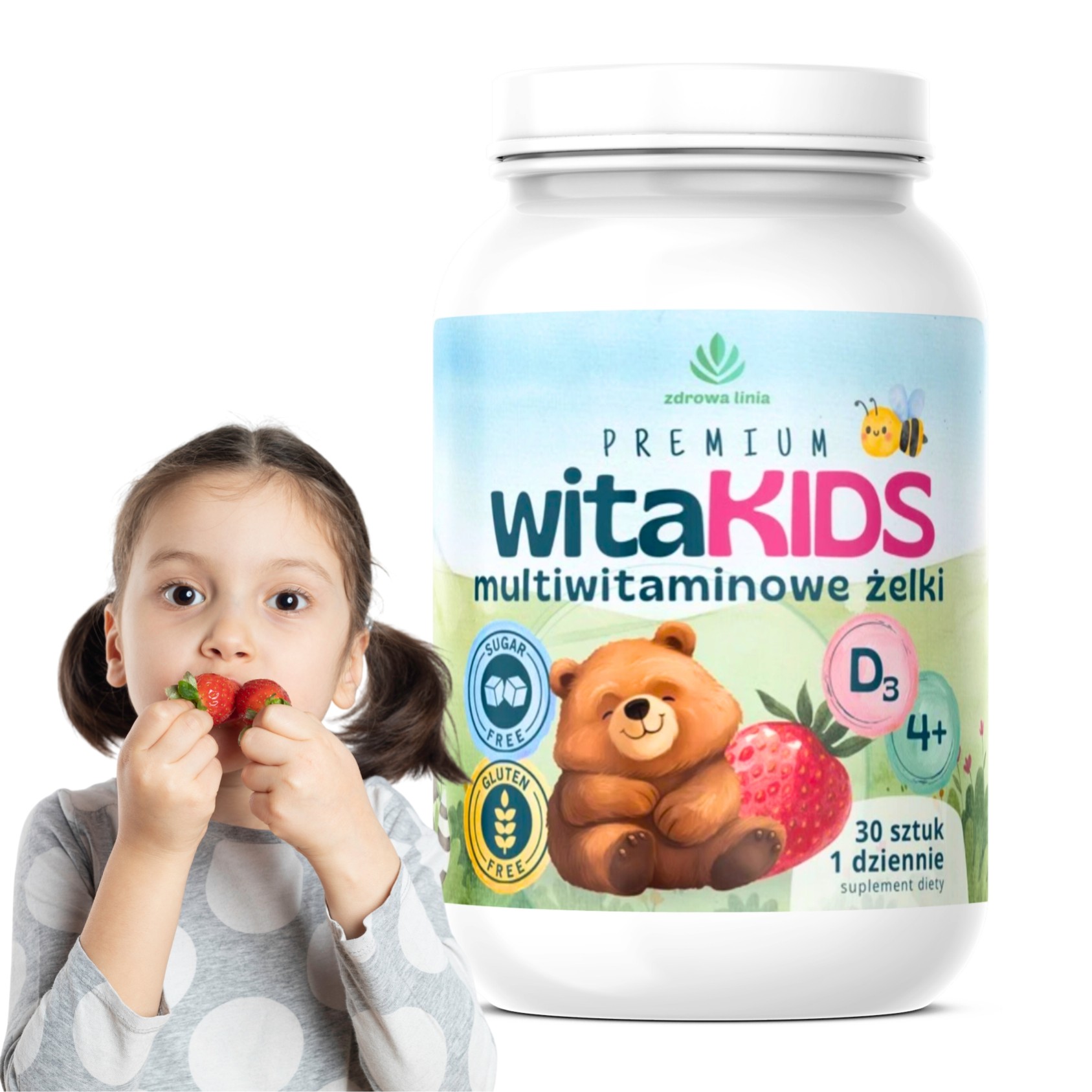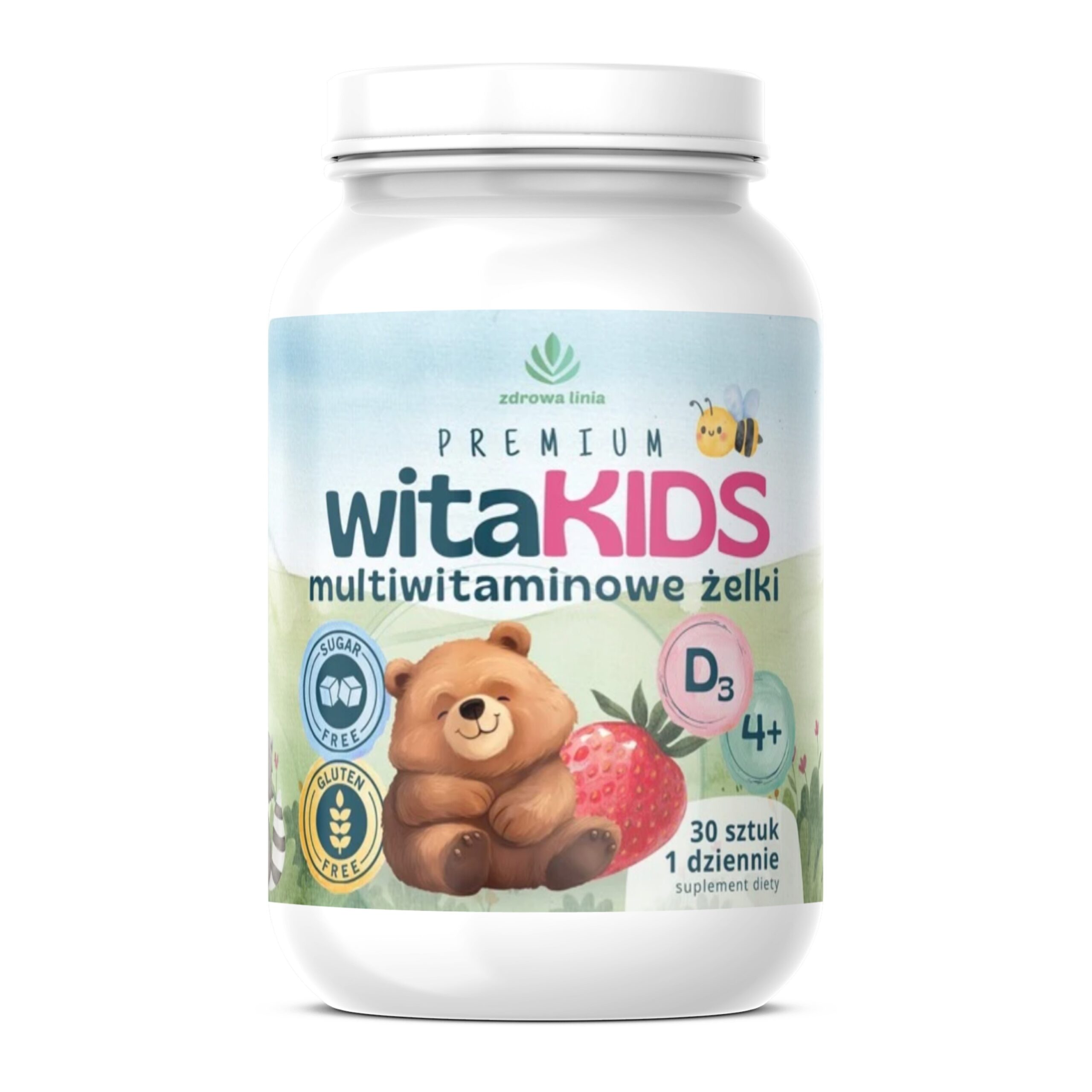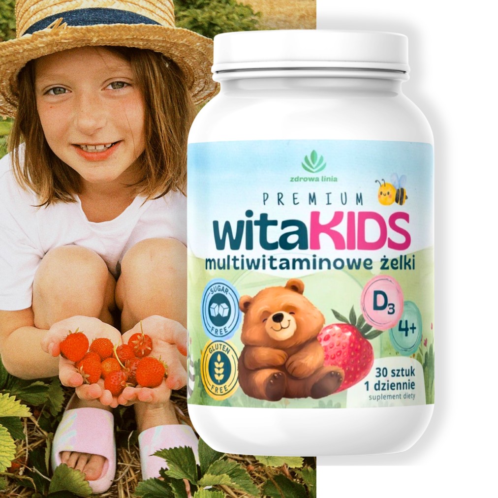 Multiwitaminowe żelki dla dzieci witaKIDS o smaku truskawkowym, zawierające witaminę D, która przyczynia się do prawidłowego funkcjonowania układu odpornościowego oraz wzrostu i rozwoju kości u dzieci.