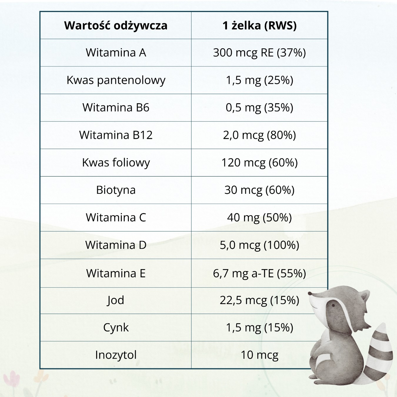 Składniki: substancje słodzące: syrop maltiolowy, erytrytol; żelatyna wołowa, kwas L-askorbinowy, kwas cytrynowy, kwas jabłkowy, substancja żelująca: agar, octan D-alfa-tokoferylu, naturalny aromat truskawek, cytrynian cynku, koncentrat z soku z marchwi, cyjankobalamina, olej roślinny: kokosowy, D-pantotenian wapnia, barwnik: kurkumina, palmitnian retinylu, clorowodorek pirodyksyny, substancja glazurująca: wosk carnauba, choleklciferol, kwaspteroilomonoglutaminowy, D-biotyna, jodek potasu, inozytol.