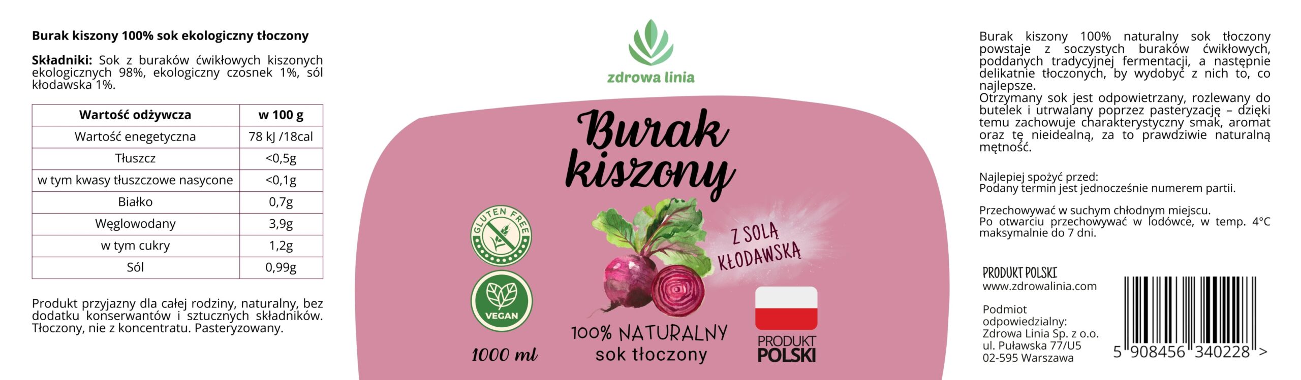 Składniki: Sok z buraków ćwikłowych kiszonych ekologicznych 98%, ekologiczny czosnek 1%, sól kłodawska 1%.